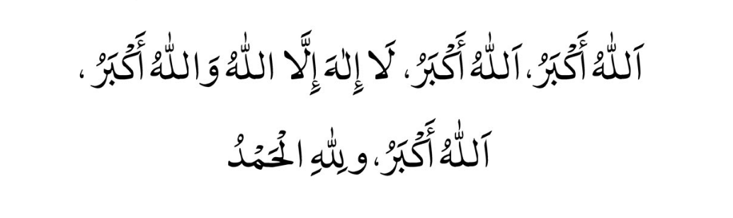 Allāhu Akbar, Allāhu Akbar, Lā ilāha illallāhu wallāhu Akbar, Allāhu Akbar, Walil lāhil hamd.